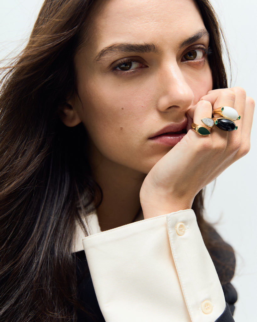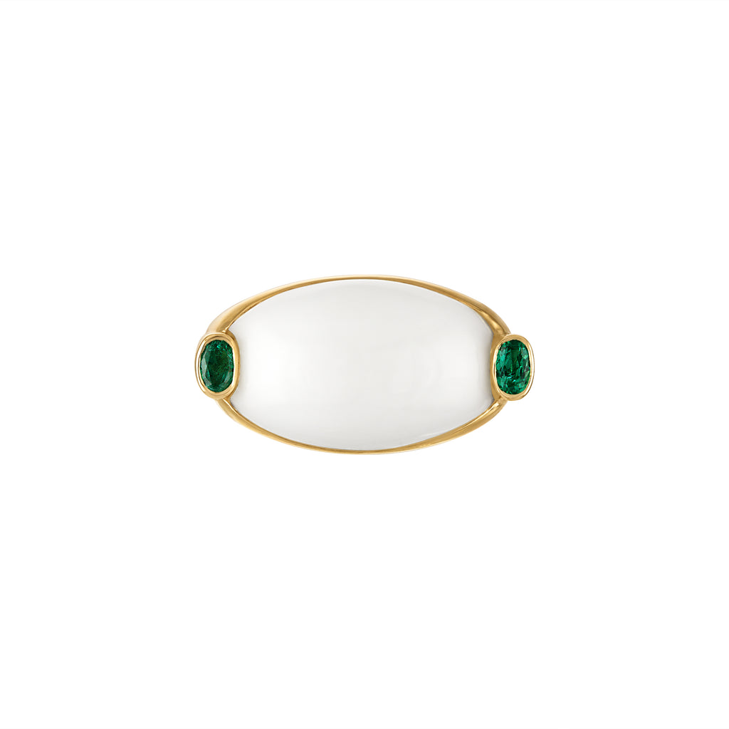 The Oval Onyx and Emerald Signet Ring is composed of 18k gold. Ring measures 22mm in length x 12 mm in width with onyx center stone; emeralds are .40 ct total each.